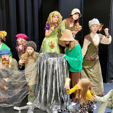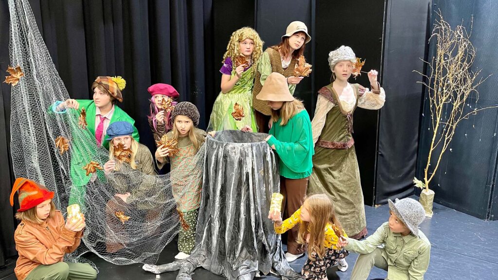 Koko perheen satunäytelmä Puuhiset (ensi-ilta 6.12.2022) on hyvä esimerkki monipuolisesta kurssitoiminnan yhdistämisestä. Ammattimaisessa teatteritilassa hyödynnetään opittua teatteri-, kuvataide-, lavastus-, tanssi- ja musiikkiosaamista. Kuva Pia Varuhin-Palo.