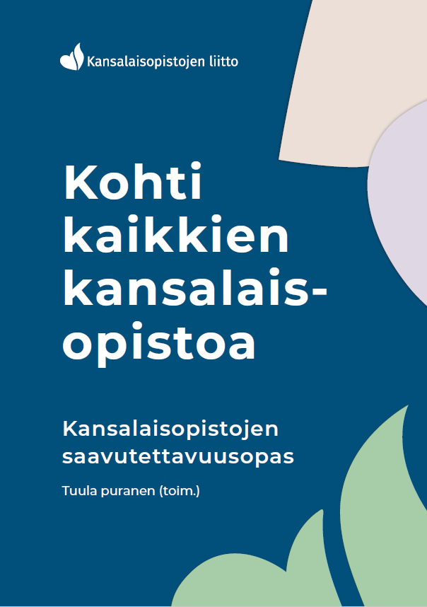 Kansalaisopistojen saavutettavuusopas on saatavilla PDF ja tekstimuotoisena. Tämä opas kuuluu tukimateriaaleihin, joita Saavutettava ja matalan kynnyksen kansalaisopisto -hankkeessa (2021–2023) on tuotettu kansalaisopistojen käyttöön. Saavutettava ja matalan kynnyksen kansalaisopisto -hankkeen tavoite oli lisätä ihmisten mahdollisuuksia sivistää itseään opistojen kursseilla elinikäisen ja jatkuvan oppimisen hengessä.